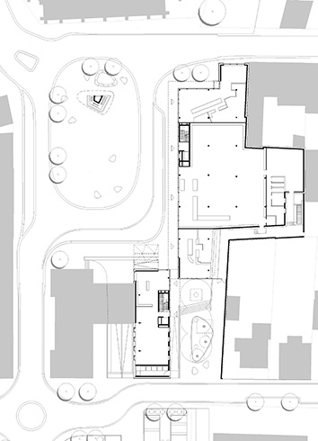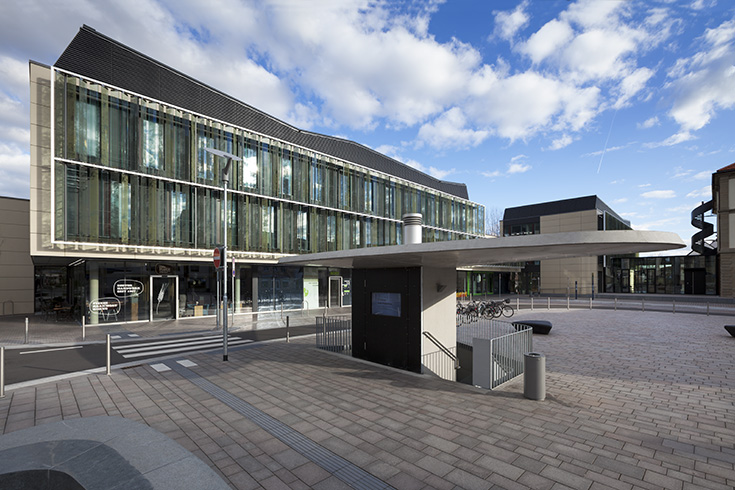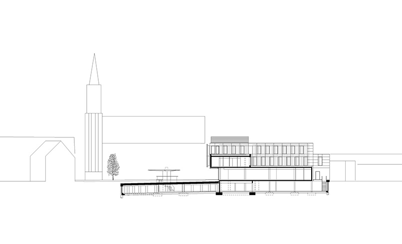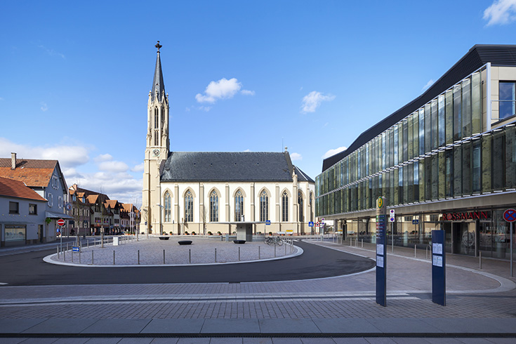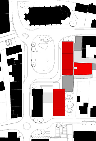 Diese Maßnahmen für die verträgliche Einordnung des Individualverkehrs bilden die Basis für die stadträumliche Neuordnung. Die Grundidee der Bebauung ist die Folge von drei jeweils charakteristischen Plätzen. Den Platz an der evangelischen Kirche, den zentralen Platz der Drehscheibe selbst und den neu geschaffenen Platanenplatz mit dem alten Baumbestand. Eine Passarelle verbindet die Platzräume und dient der Haupterschließung der einzelnen Gebäudenutzungen. Die vielfältigen Funktionen des Hauses werden so ins stadträumliche Gefüge eingeflochten.