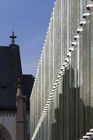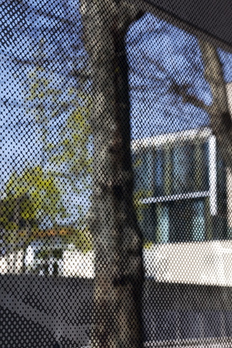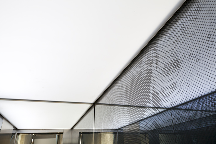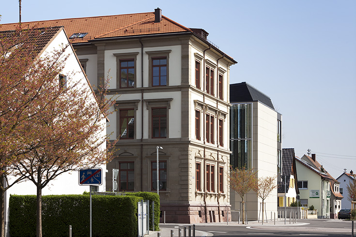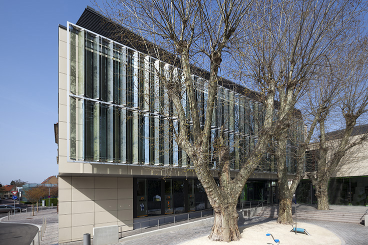 Das in den Obergeschossen gelegene Ärztehauses verkleidet ein Vorhang aus bedruckten Glaslamellen. Hinter der Glasebene liegt eine hochgedämmte Holzfassade. Das Gebäude erfüllt die Anforderungen des Passivhausstandards. Die im Ausbauraster gesetzten Fensterelemente sichern maximale Flexibilität. Die Bedruckung der Lamellen sichert den erforderlichen Sonnenschutz und hält die Nutzung frei von Störungen. Umgekehrt bildet der gefaltete Paravent eine neutrale, heitere Platzkante, in deren Spiegelung die historischen Nachbargebäude präsent sind. Die Bedruckung mit dem stark aufgelösten Bild einer Baumkrone- die Kiefer ist charakteristisch für Walldorf- nimmt der Fassade außen die Härte und gibt nach Innen ein mildes, angenehmes Licht.
