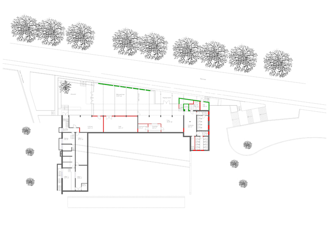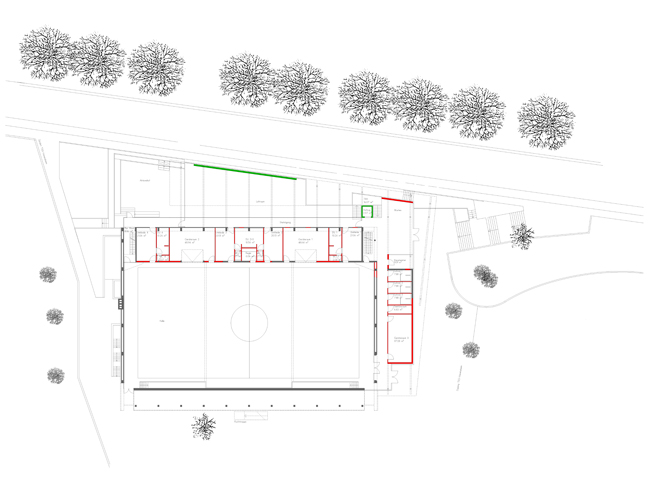 Diese Leistung fordert Sensibilität im Umgang mit der vorhandenen Sporthalle. Maßnahmen am Gebäude sollen respektvoll die vorhandenen Qualitäten bewahren und die gesamte Anlage der Tradition des Bestandes folgend in einen zeitgemäßen Zustand weiterentwickeln. Zu den besonderen Merkmalen des Bestandes zählen neben den ausgewogenen Proportionen des Baukörpers u.a. das filigrane Dachtragwerk sowie die Belichtung der Halle.