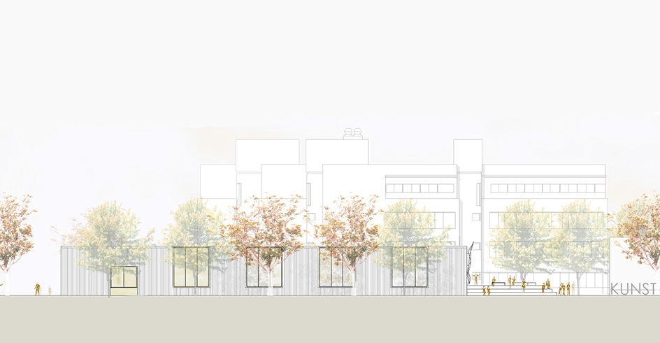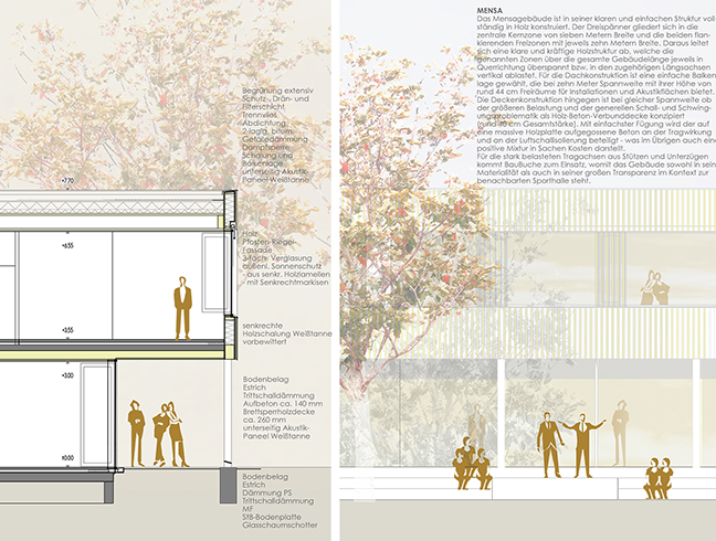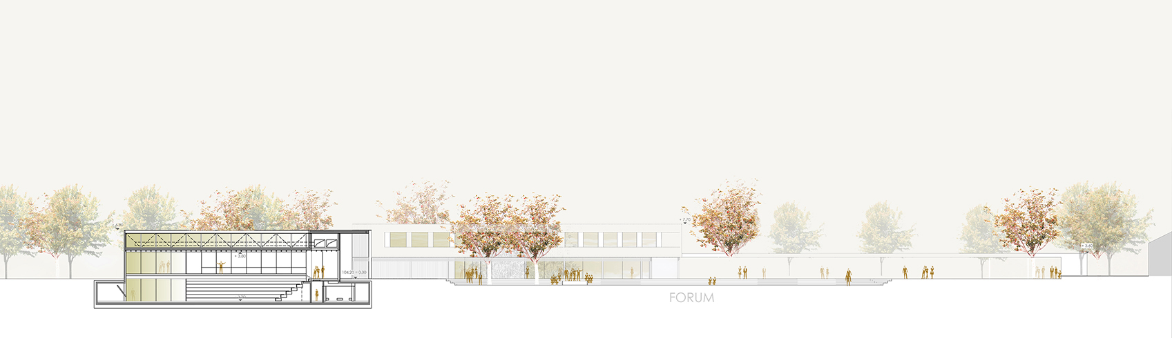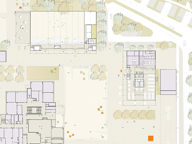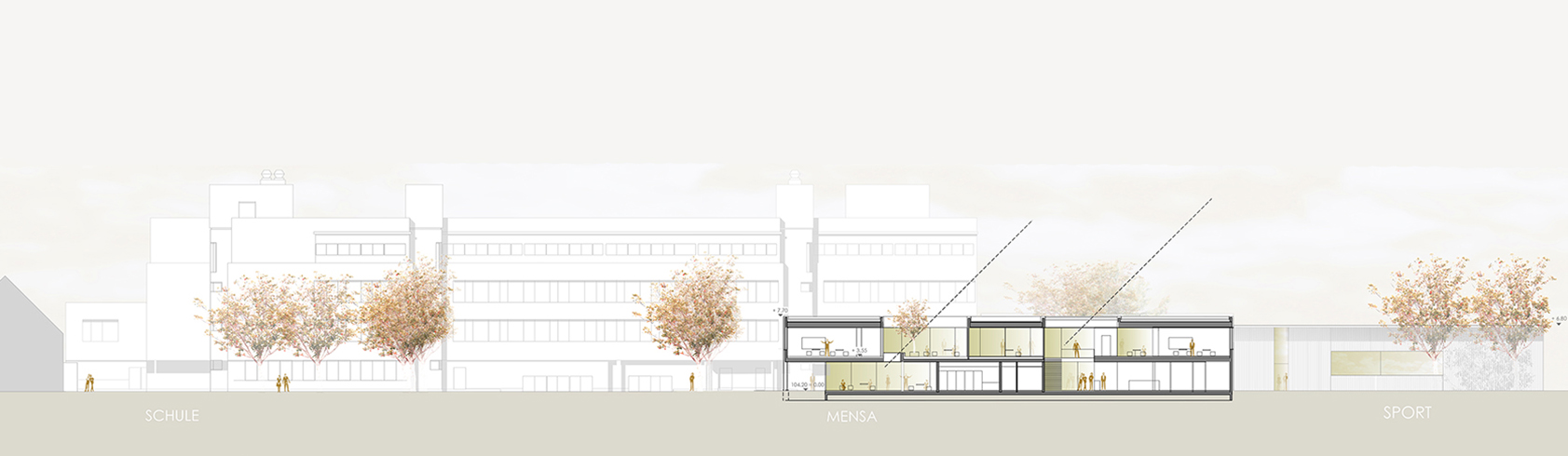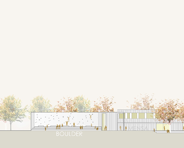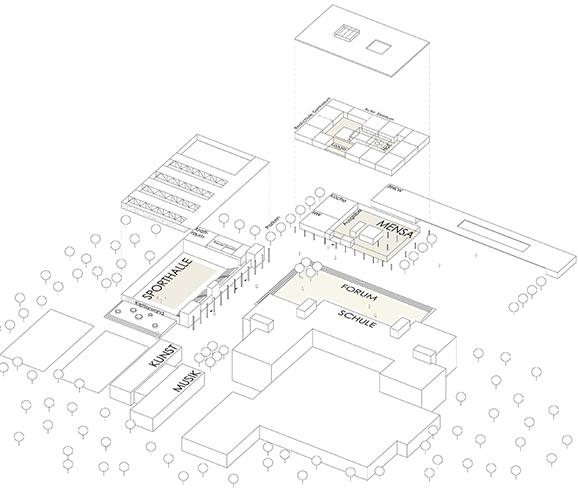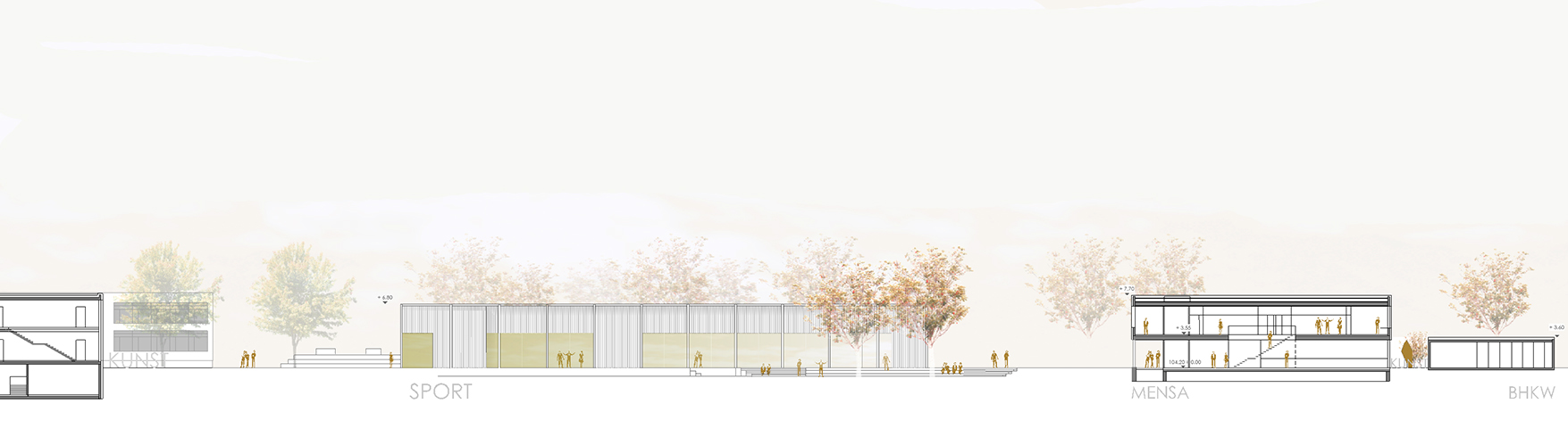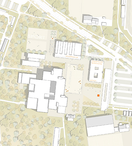 Die neuen Nutzungen der Ganztagesbetreuung mit Mensa und der Sporthalle beziehen sich auf den Kristallisationspunkt der Schule und bilden unter Einbeziehung des vorhandenen Musik- und Kunst Pavillons als Reihe von Satelliten einen inneren Rand vor der Waldkulisse.