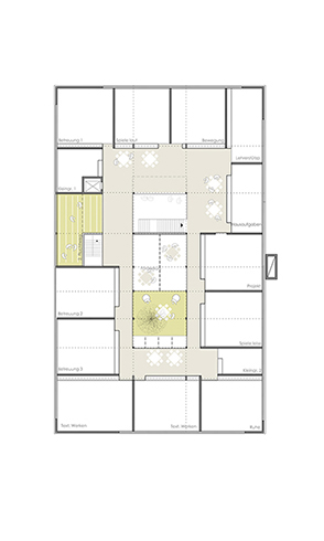 Im Ganztagesbereich sind die Funktionseinheiten der Realschule und des Gymnasiums zusammengefasst und um eine Mittelzone gruppiert. Die Gliederung dieser inneren Raumstruktur in unterschiedliche Bereiche – der Galerie und des Innenhofes - schafft differenzierte Flächen mit hoher Aufenthaltsqualität. Dabei ist die Galerie als Aktions- und Gemeinschaftszone, der zum Innenhof orientierte Abschnitt als Ruhe- und Rückzugsbereich charakterisiert. Die Räume des Programms werden entsprechend zugeordnet.
