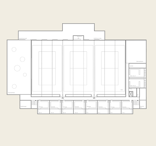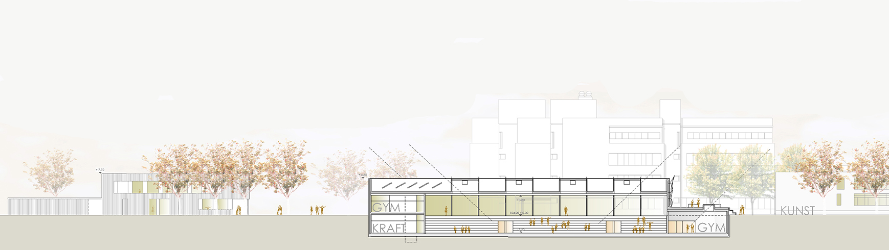 Das Absenken der Sportfläche ermöglicht den Zugang zur Sporthalle auf dem Niveau der Zuschauergalerie. Diese Flächen orientieren sich niveaugleich auf ganzer Länge zum Schulhof. Über den abtrennbaren Eingangsbereich sind zudem die Programmflächen Sanitätsraum, Hallenwart und Sporttheorieraum sowie Kraftraum erschlossen. Auf Sportebene befinden sich neben den eigentlichen Hallenbereichen mit Gymnastikhalle und Gymnastikraum die Nebenräume und Duschen.